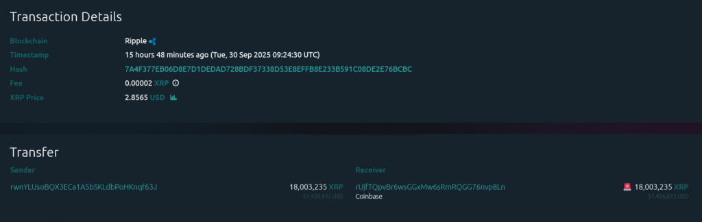 Langkah whale Cardano kontras dengan pergerakan XRP baru-baru ini. Menurut Whale Alert, ada transfer 18 juta XRP senilai sekitar $51,4 juta ke Coinbase. Bukti transfer XRP whale dari hasil pelacakan oleh Whale Alert bisa lihat di bawah ini.